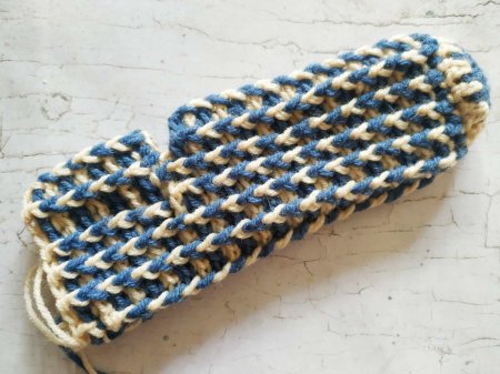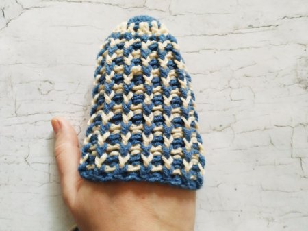 Теперь вяжем еще 1 такой ряд, но в нем сделаем отверстие для пальца. Для этого наберем 8 воздушных петель, пропустим 8 петель основания и продолжаем вязать ирссн и лрссн, как в начале ряда.