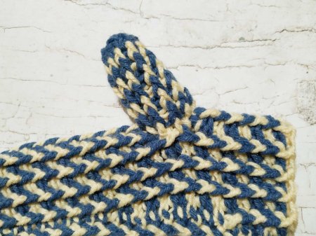 И далее предыдущий ряд повторяем, меняя нить. Вяжем, пока не дойдем до большого пальца.
