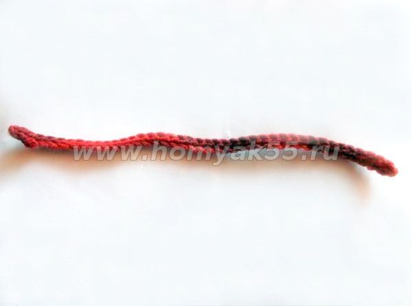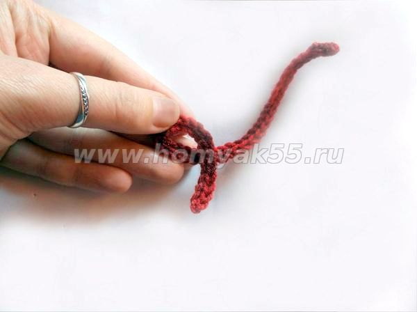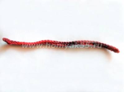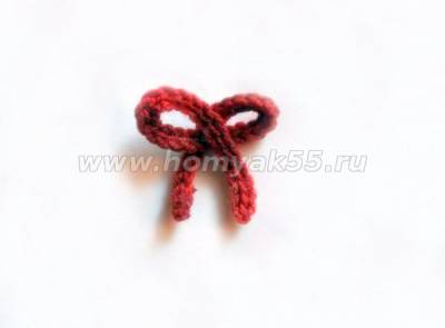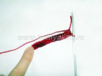 В первых двух рядах делаем по три убавки. В следующих вяжем два столбика вместе. Когда останется 6-7 петель, стягиваем. И свяжем бантик. Набираем цепочку из 30-35 воздушных петель. И провязываем ее полустолбиками без накида.
