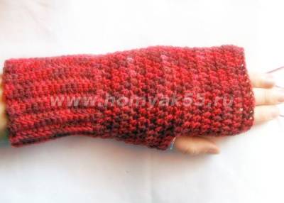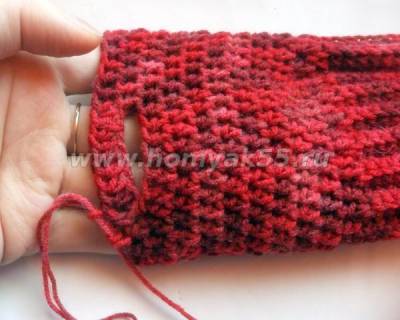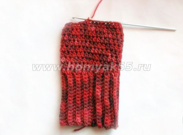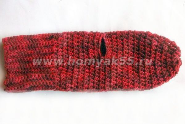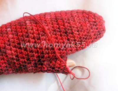 Теперь начинаем вязать основную часть варежки. Она вяжется прочными столбиками или, как их еще называют, полустолбиками с накидом. То есть делаем накид, вводим крючок в столбик предыдущего ряда, захватываем рабочую нить, протягиваем ее. И провязываем сразу все три петли на крючке. Вяжем по кругу.