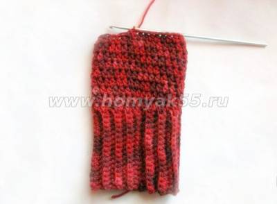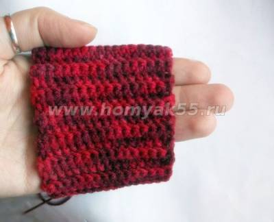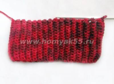 Вяжем несколько рядов. Примеряем резинку к руке. Когда обе стороны резинки будут соприкасаться, провяжем еще один ряд и закончим вязание резинки.