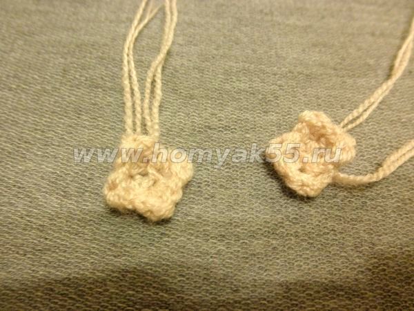 Из нити того же цвета набираем цепочку из 5 воздушных петель, замыкаем ее в кольцо и вывязываем 4 лепестка по следующей схеме: * столбик без накида, столбик с накидом, столбик без накида * из каждой петли.Нитки завязываем узелком на обратной стороне детали и обрезаем. Пришиваем четырехлистник к митенке, разместив по центру бусину.