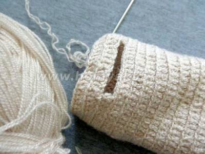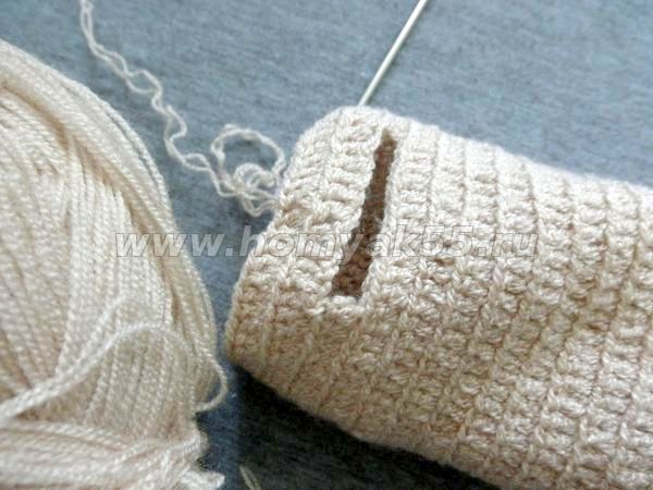 Продолжаем вязание до начала большого пальца (определяем примеркой). В этой части вязания делаем прорезь для пальца, набирая вместо столбиков воздушные петли. Шов при этом должен находится по центру внутренней стороны ладони.