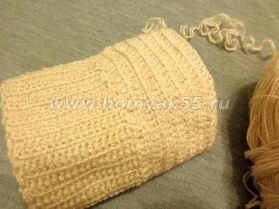 Примеряем митенку. Если отверстие для большого пальца выглядит слишком широким, обвязываем его двумя рядами столбиков без накида, уменьшив в первом ряду количество петель. Для этого, через равные промежутки, одну петлю предыдущего ряда пропускаем, не провязывая.