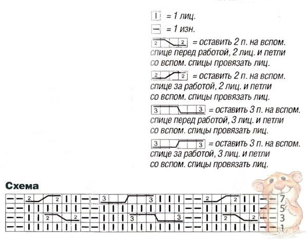 Узор из кос (ширина 29 петель): вязать по схеме, в чётных круговых рядах петли вязать по рисунку. Повторять с 1-го по 8-й ряды.