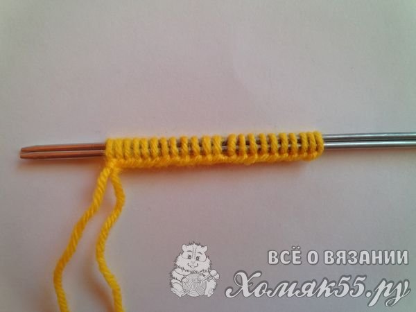 Итак, сначала нам нужно связать манжетик. Для этого на спицы набираем двадцать две петельки.