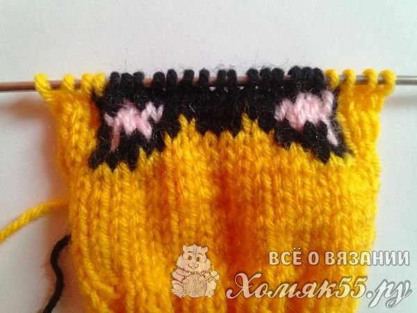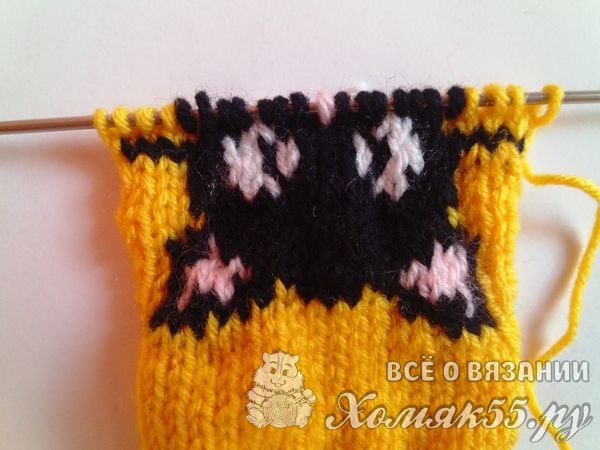 Все. Рисунок мы связали. Провязываем теперь один ряд желтыми нитками.