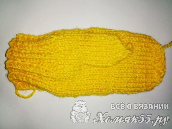 Вяжем вторую часть варежки. Сначала резинку, потом десять рядов лицевой глади. И формируем место под палец. Провязываем четыре петельки. А дальше семь петель вяжем ниткой контрастного цвета. Остальные петли желтой ниткой.