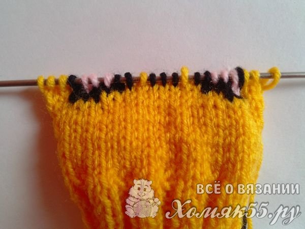 Второй ряд. 3 желтых петли, 1 черная, 1 розовая, 3 черных, 7 желтых, 3 черных, 1 розовая, 1 черная и 3 желтых.
