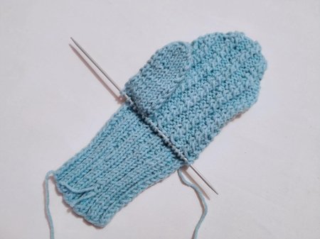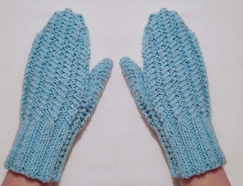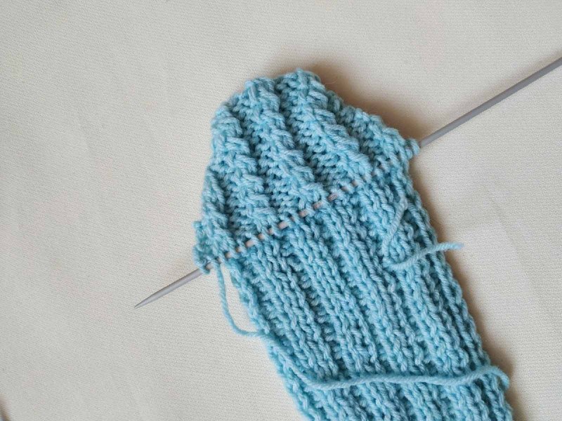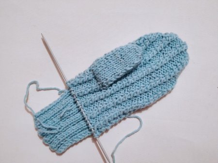 Далее просто снова переходим на вязание оставшейся части варежки. Довязываем до резинки.