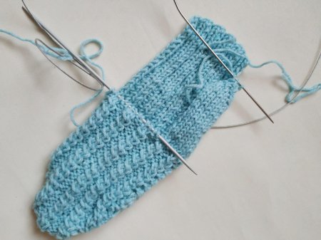 Вяжем, пока не довяжем почти до конца пальца. Затем делаем убавки по бокам только в лицевом ряду.