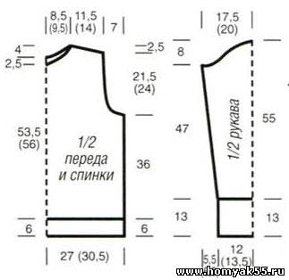 30 (34) петель = 95 (107) петель. Через 36 см. = 58 ряд от планки закрыть с обеих