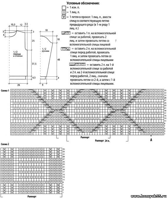 На спицы №3,5 наберите 114 петель и вяжите 4,5 см резинкой 2 х 2, равномерно прибавив 12 петель в последнем ряду = 124 петли + 2 кром. петли. Далее вяжите спицами №4 узором 1 от стрелки А. На общей высоте 42 см для пройм закройте с обеих сторон в каждом 2-м ряду 1 раз х 4 петли, 1 раз х 3 петли, 1 раз х 2 петли, 2 раза х 1 петле.$CUT$ На общей высоте 61 см закройте для выреза горловины средние 20 петель и обе стороны закончите раздельно. С края горловины закрывайте в каждом 2-м ряду 1 раз х 4 петли, 2 раза х 2 петли и 6 раз х 1 петле. Одновременно на общей высоте 67 см закройте для скосов плеча с боковой стороны 10 петель и затем в каждом 2-м ряду еще 1 раз х 10 петель и 1 раз х 6 петель. На общей высоте 70 см закройте все оставшиеся петли. Другую сторону горловины довяжите симметрично.