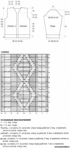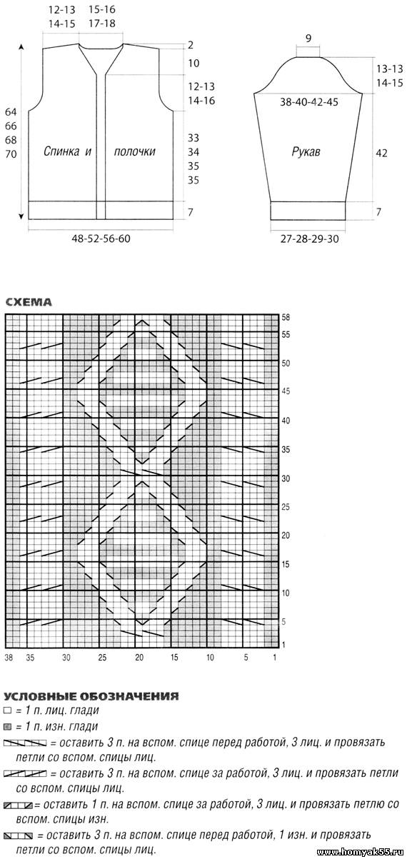 Основной узор (ширина 38 петель): вязать по схеме. Выполнить 1 раз с 1-го по 30-й ряды, затем повторять с 3-го по 30-й ряды.