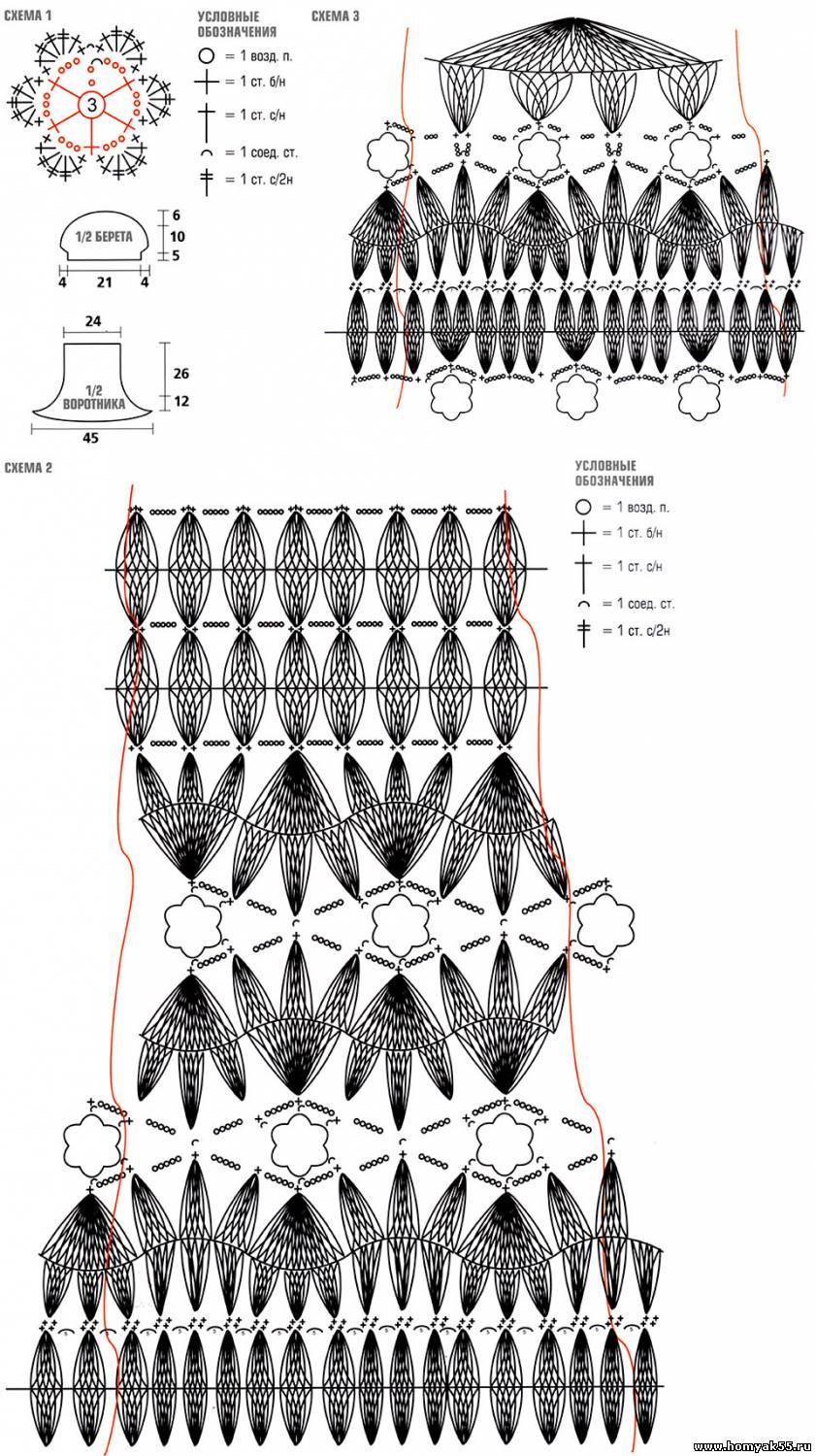 На спицы жёлтой нитью (1 нить KLEMENT + 2 нити JENNY) набрать 130 петель и связать 4 см резинкой. Затем вязать лиц. гладью, при этом через 3 ряда вязать коричневой двойной нитью. Через 15 см от наборного края работу разделить на 8 частей следующим образом: 1 кром., * провязать 2 петли вместе лиц. за заднюю стенку, 12 лиц., провязать 2 петли вместе лиц. за переднюю стенку, повторить от * 7 раз, 1 кром. В изн. рядах петли вязать по рисунку. Продолжать убавления до тех пор, пока не останется 10 петель. Оставшиеся петли стянуть рабочей нитью и конец спрятать. Выполнить задний шов. Для верхней части берета светло-жёлтой нитью на вилке крючком № 1,6 связать 2 полосы из 215 петель, 1 полосу из 70 петель и соединить их по схеме 3. Верхнюю часть берета пришить к берету по линии резинки. Крючком № 1,6 связать 34 цветочка и нашить их на берет (см. фото).