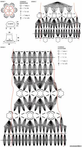 Светло-жёлтой нитью на вилке крючком № 1,6 связать 4 полосы из 270 петель и 2 полосы из 180 петель (см. рисунок). Соединить полосы по схеме 2 и сомкнуть получившееся полотно в кольцо.