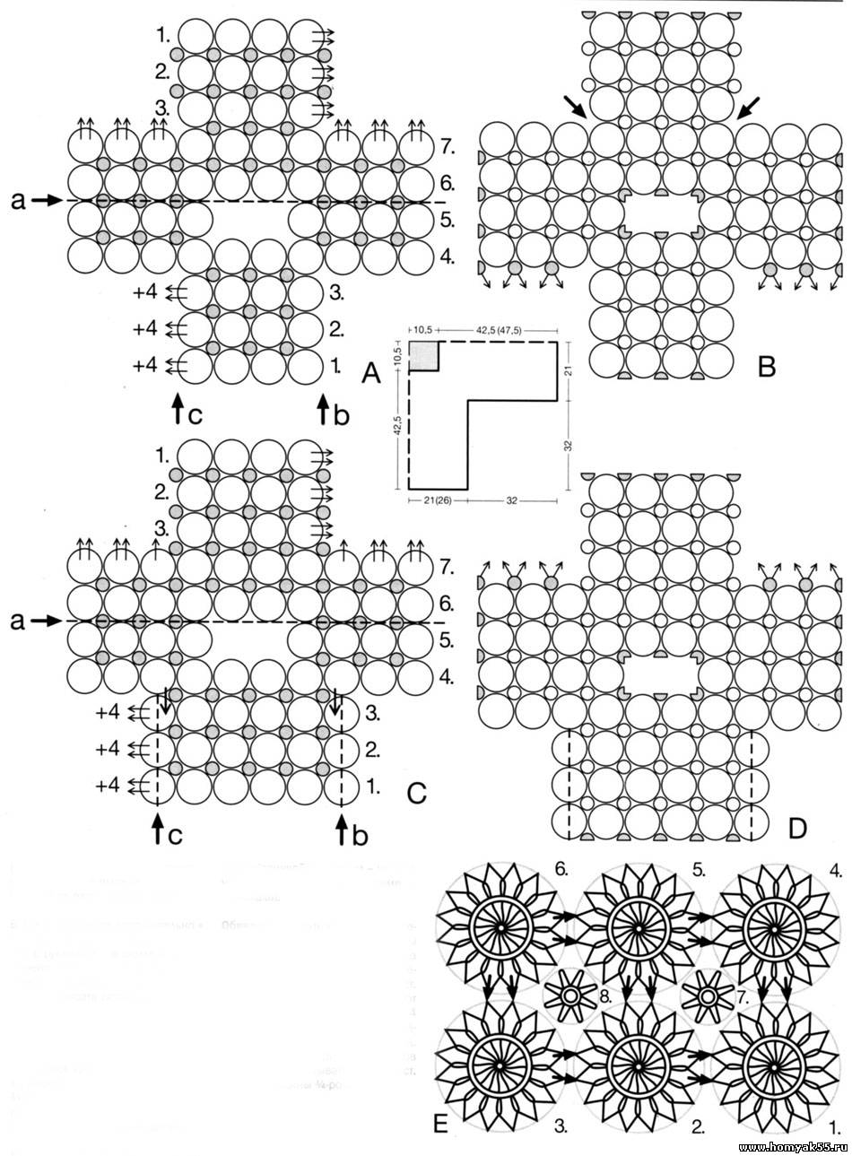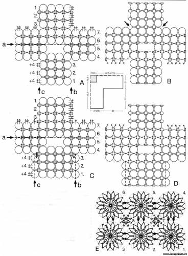 Связать 1 мотив, 2-й мотив при обвязке соединить в месте последних двух арок ВП с 1-м мотивом. Для этого после 14-й арки из ВП и СБН *связать 4 ВП, затем для соединения связать СБН в арку из ВП предыдущего мотива, 4 ВП*, след. 2 петли вилки связать вместе СБН, повторить от * до * еще 1 х, выполняя при этом СБН из находящихся рядом арок из ВП и замкнуть круг СС в первый СБН. Соединять по этому принципу мотивы по 2 находящимся рядом аркам из ВП. В схеме Е места соединений указаны стрелкой, цифры от 1 до 8 задают очередность при соединении.При соединении мотивов в одном ряду арки попарного соединения должны находиться друг напротив друга, т. е. вставлять новый, 3-й мотив, на расстоянии 6 арок из ВП от предыдущего места соединения. При соединении след. ряда мотивов, см. мотивы 4-5-6 по схеме Е, обращать внимание, что между попарными соединениями всегда пропускаются 2 арки из ВП - сюда позже будут ввязываться розочки. 5-й мотив присоединить 11-й и 12-й аркой из ВП сначала ко 2-му мотиву, затем связать 2 арки из ВП и с последними 2 арками из ВП присоединиться к 4-му мотиву.