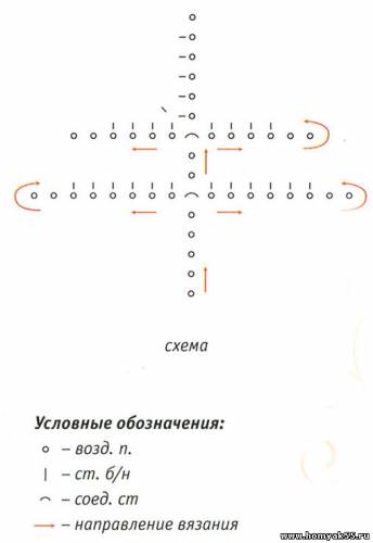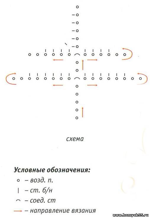 Вяжите вытянутыми петлями по кругу. Свяжите 4 ВП и замкните их в кольцо. В центр кольца ввяжите 8 СБН.1 - 5-й ряды: вяжите, удваивая каждую вторую петлю.
