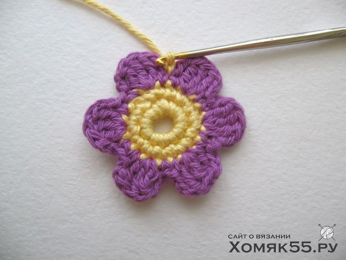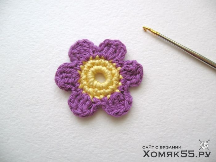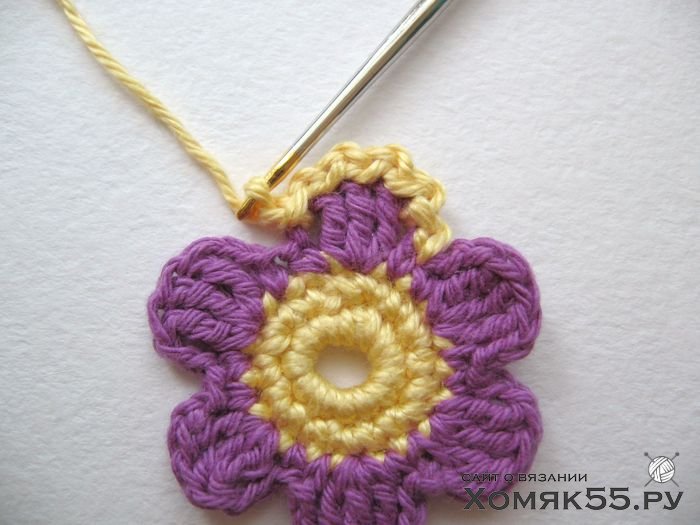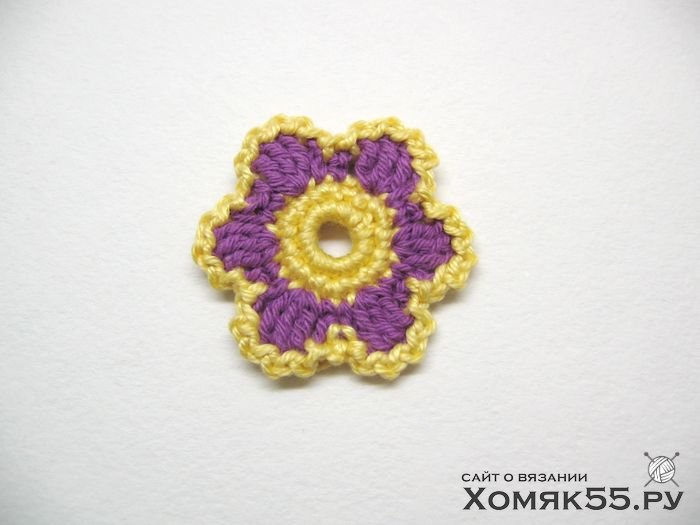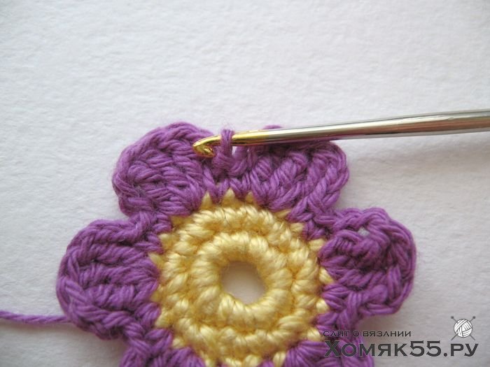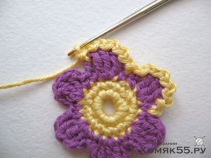 Вот так теперь выглядит цветок. Нам остается только обвязать его и для этого мы снова берем желтую нить. Обратите внимание: все лепестки начинаются со СБН, и заканчиваются СБН. Во время обвязки мы будем обвязывать только начальные СБН, конечные СБН будем пропускать.
