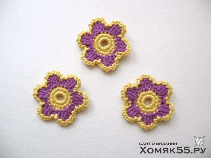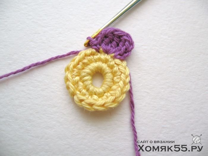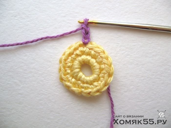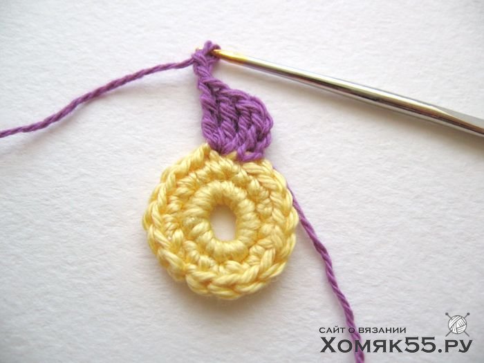 Приступаем к вязанию 3-го ряда. В нем на каждых трех петлях мы будем вывязывать по одному лепестку. Всего таких лепестков получится 6. Берем нить фиолетового цвета и из любой петли предыдущего ряда вывязываем 3 петли подъёма.