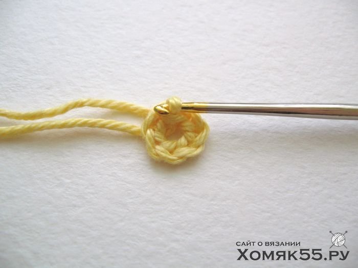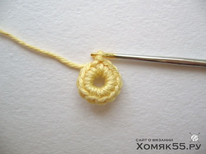 1 ряд (жёлтая нить): вяжем одну петлю подъёма и обвязываем кольцо 12-ю СБН. Одновременно прячем под ними хвостик нитки. Заканчиваем ряд соед. столбиком в первый столбик ряда.
