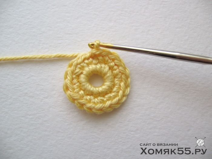 Начнем наше вязание с вывязывания серединки цветка. Желтой нитью вяжем цепочку из 7 возд. петель и замыкаем ее в кольцо соед. столбиком.