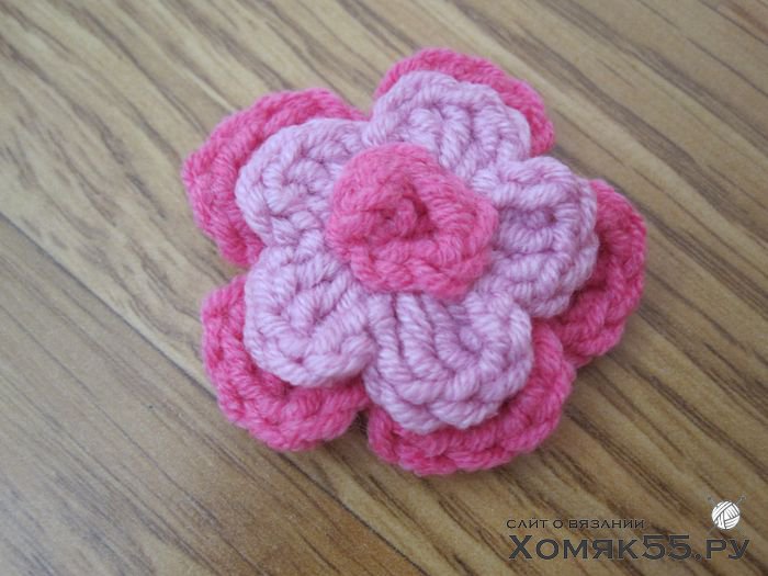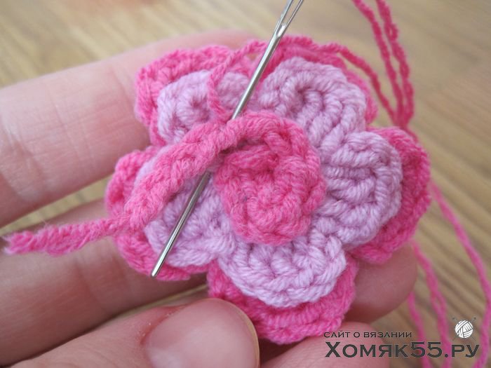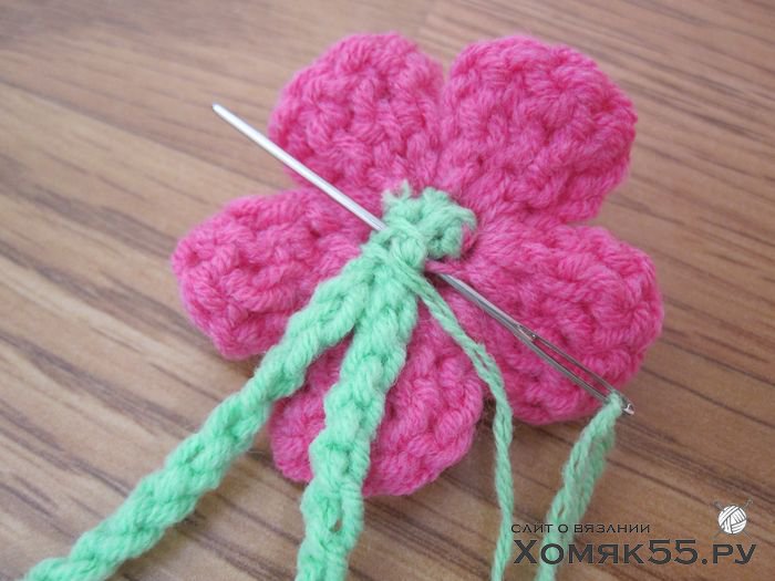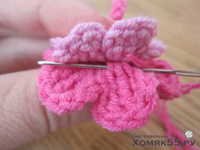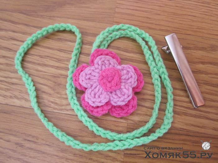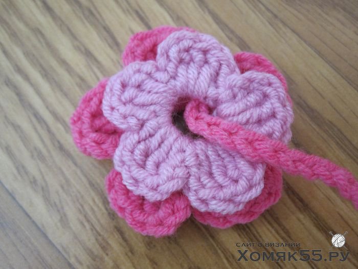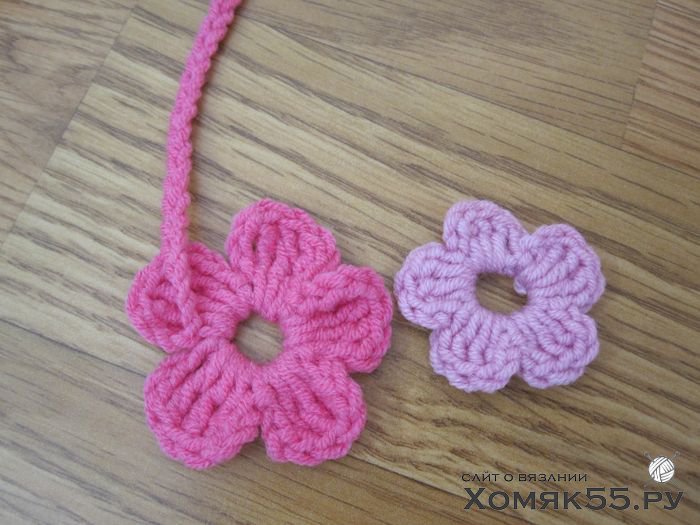 Маленький цветок кладем поверх большого и через центральную часть продеваем цепочку из воздушных петелек.