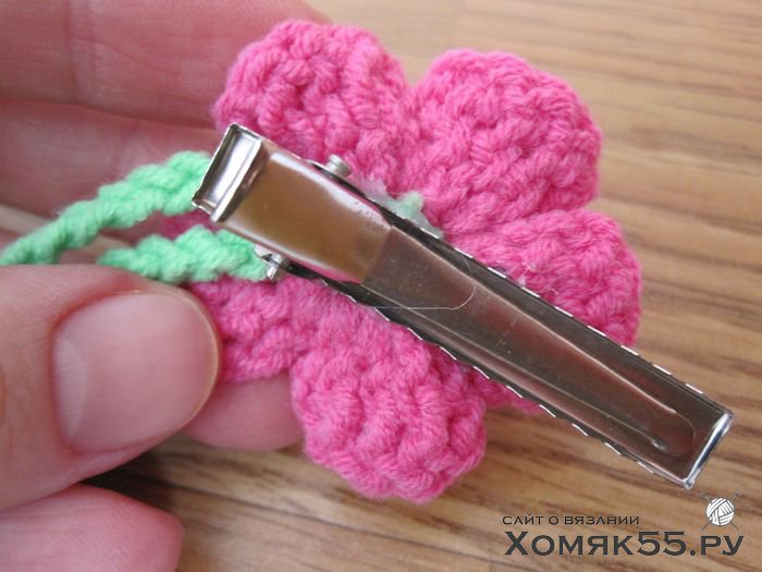 Разогрев термопистолет до нужной температуры наносим клей на верхнюю часть зажима и приклеиваем цветок, хорошо прижимая пальцами.