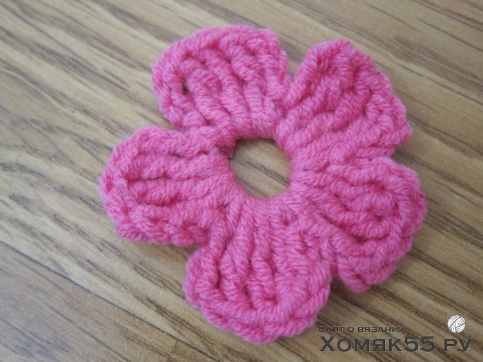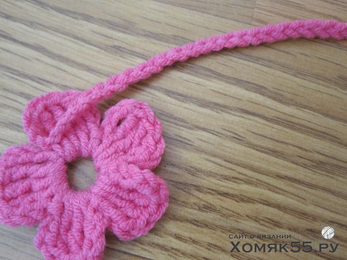 Таким образом нам надо связать в колечко пять лепестков первого цветка.