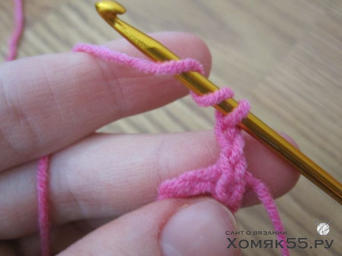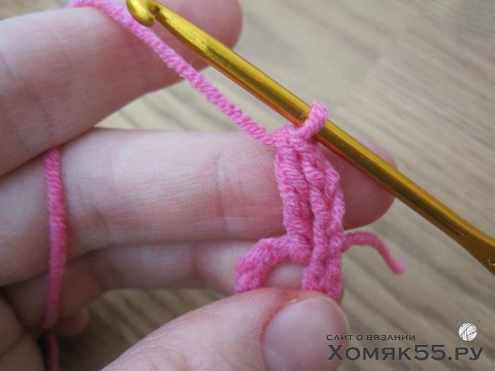 Далее формируем лепесток цветка, для чего вяжем три петельки подъема.