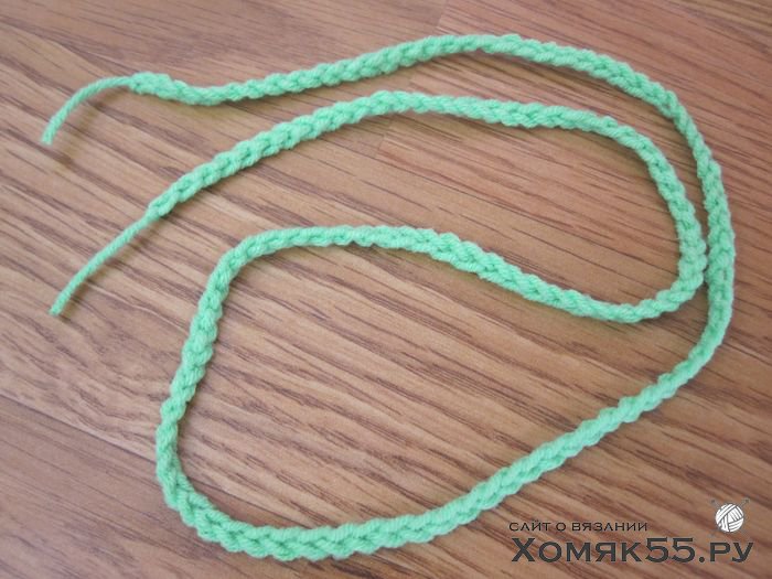 Свяжем из зеленой пряжи цепочку необходимой длины (у меня получилось 120 петелек).