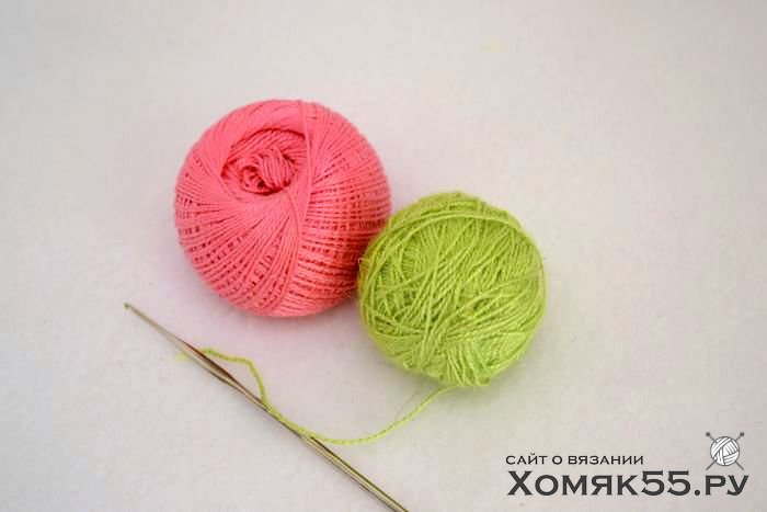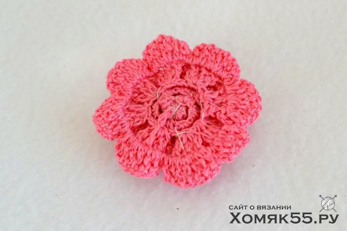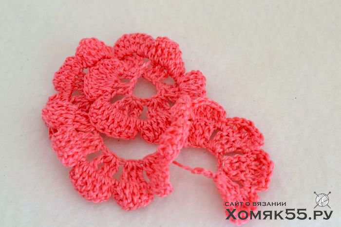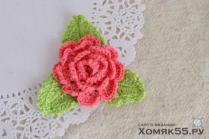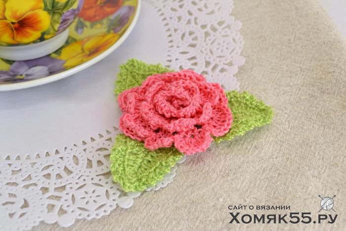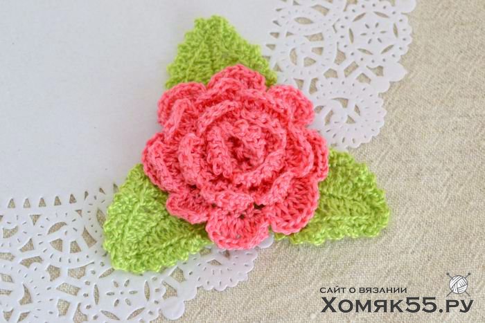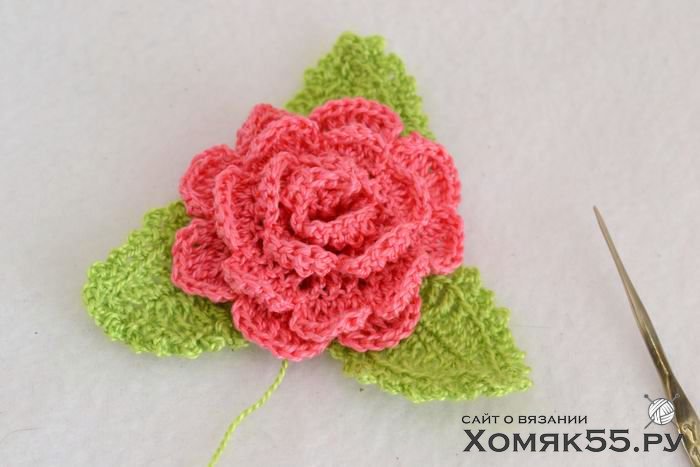 Наша розочка состоит из двух деталей, которые впоследствии сшиваются между собой: цветка и листиков. Начнем с вязания цветка.