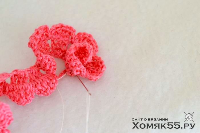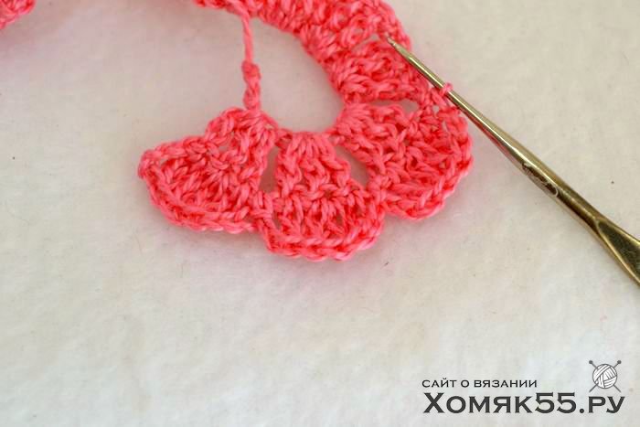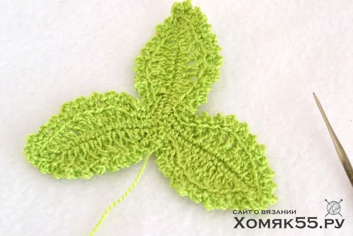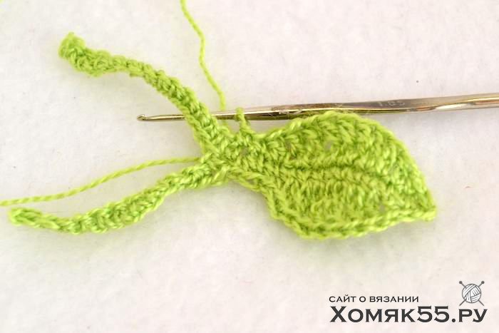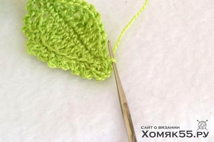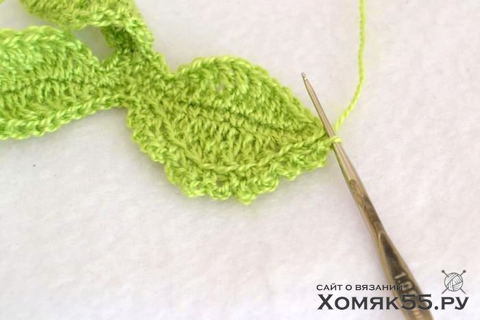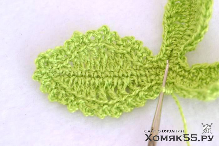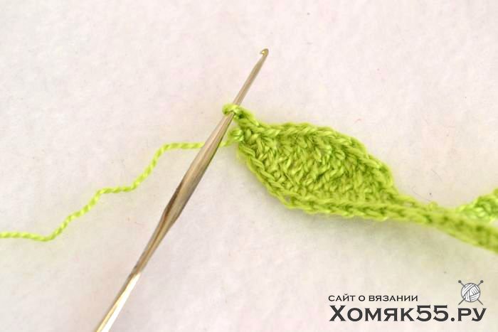 Поворачиваем вязание и так «возвращаемся» по листику - 2 СБН, 6 ССН, 2 СБН