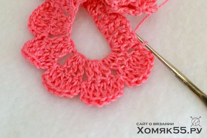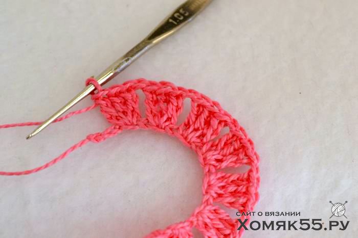 Затем 7 раз ** 1 СБН, 5 ССН * над каждым веером из трех ССН.