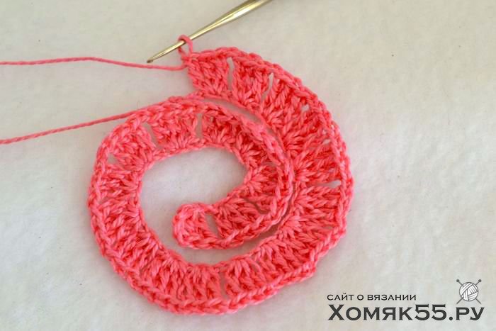 2 ряд - вяжем 3 ССН в шестую воздушную петлю и далее продолжаем вязать по рапорту до конца ряда * 1 ВП, 3 ССН (вяжем каждую третью петлю предыдущего ряда).