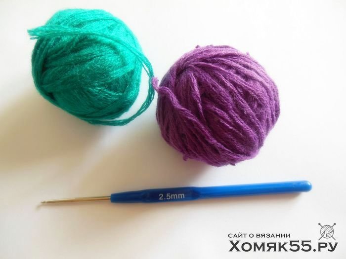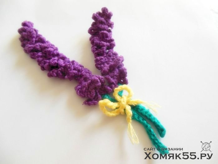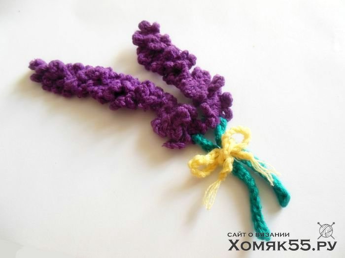 Пряжа сиреневого и зелёного цветов с помощью крючка для вязания 2.5 мм превратится в роскошный букет за считанные минуты.
