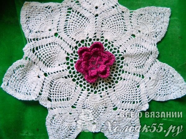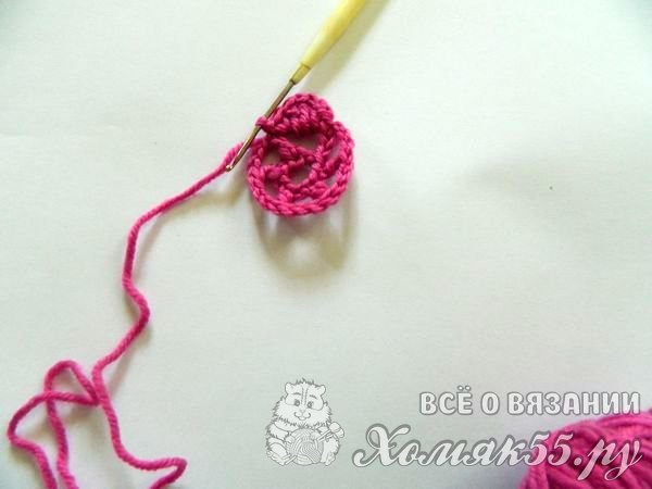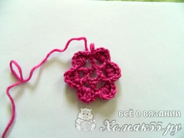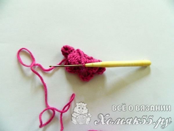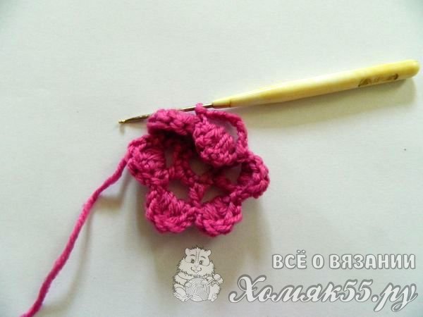 В новом ряду лепестки будут побольше. Начинаем с полустолбика, потом столбик, два столбика с накидом, два столбика с двумя накидами, два столбика с накидом, столбик и полустолбик.