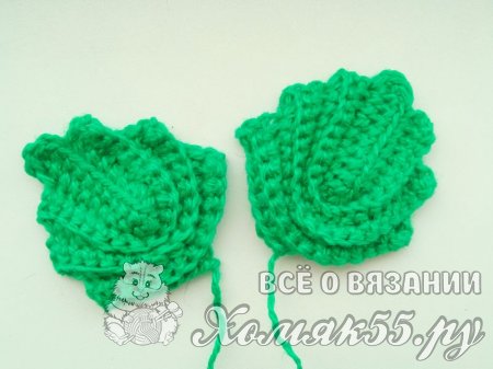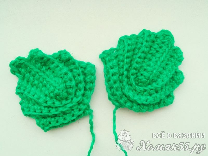 Вяжем двенадцать петелек. И провязываем ряд СБН. В последнюю петлю свяжем три СБН. И так окажемся на другой стороне цепочке. Обвяжем эту сторону аналогично первой. Затем будем вязать СБН за задние полупетли и не довяжем две-три петли до верхушки. Развернемся и провяжем в обратную сторону за задние полупетли. Теперь то же самое повторяем по второй стороне. Все это повторим еще два раза. И у нас получится листик.