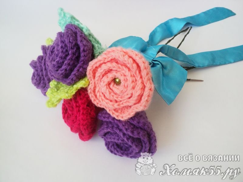 Цветы лучше вязать из пряжи средней толщины. Толстая или слишком тонкая пряжа для букета из роз не подойдет. Цвета можно взять любые. Такой букет будет смотреться хорошо как с цветами одного цвета, так и с разными оттенками.