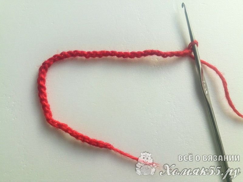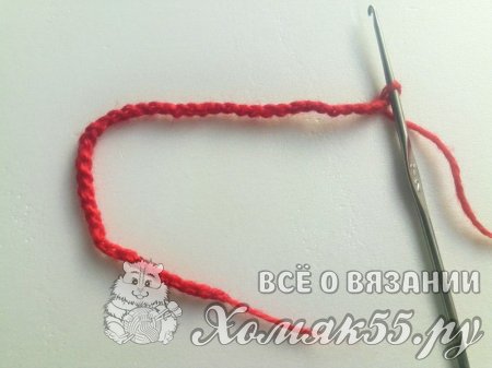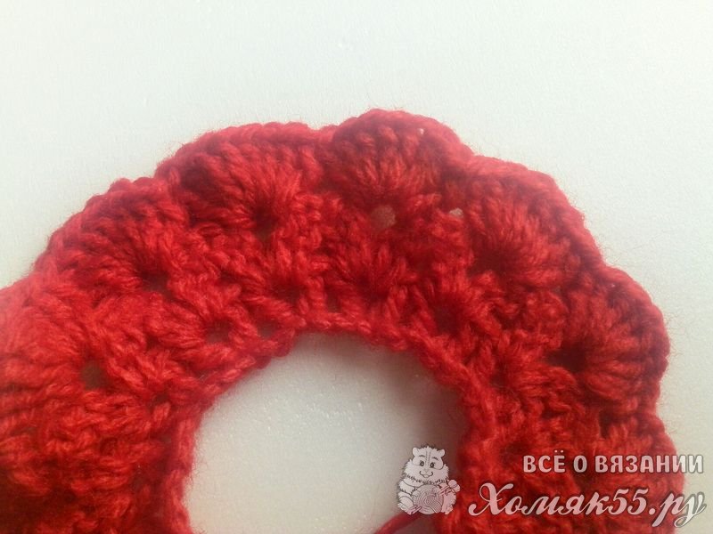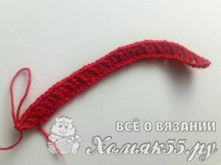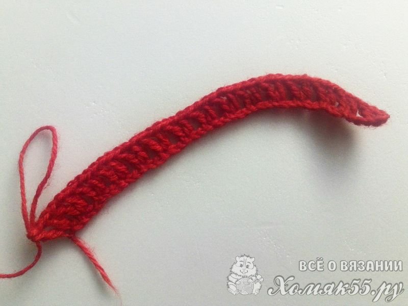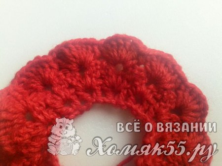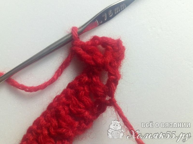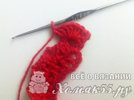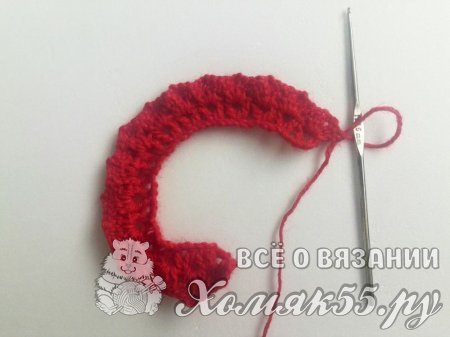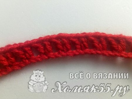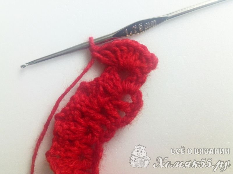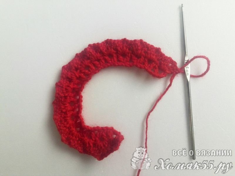 Теперь начинаем вязать заключительный ряд. Снова делаем вначале три ВП и разворачиваем вязание. Вяжем под арку, которая у нас состоит из двух ВП еще семь ССН.
