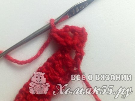 Всего нам нужно набрать число петель, которое будет делиться на три. Затем сделаем еще четыре петли и в пятую провяжем ССН. Две петли в нашей цепочке нам нужно пропустить и вязать будем далее в третью петлю. Мы в нее выполняем два ССН, но между ними сделаем одну ВП. Дальше снова пропустим две петельки в цепочке и будем опять повторять элемент ряда. Так до самого конца.