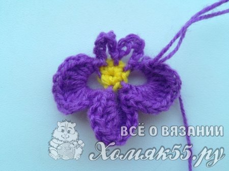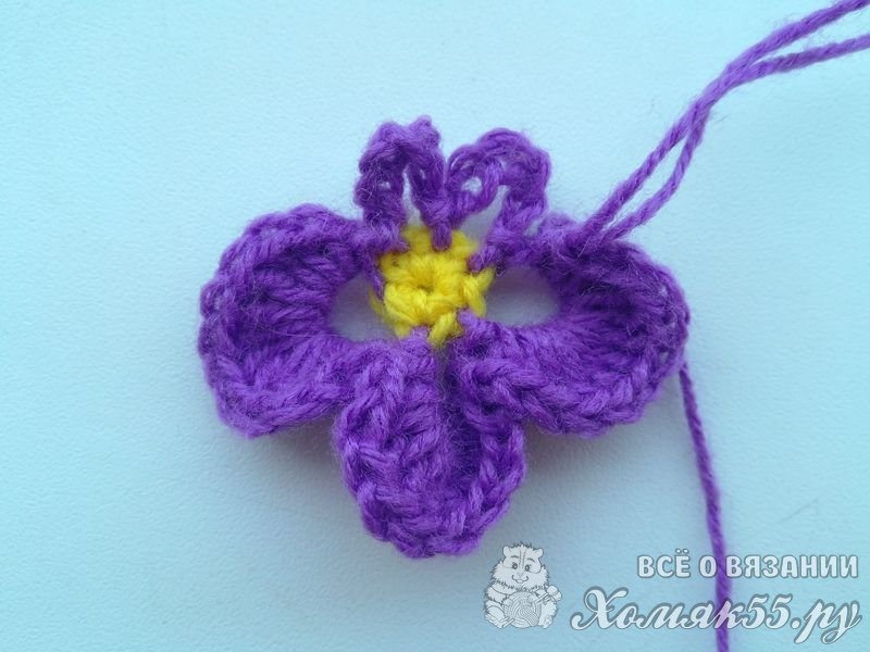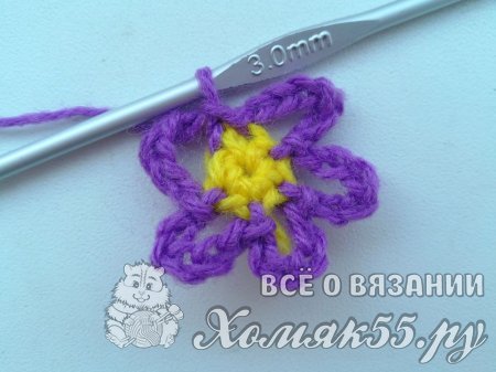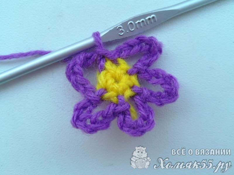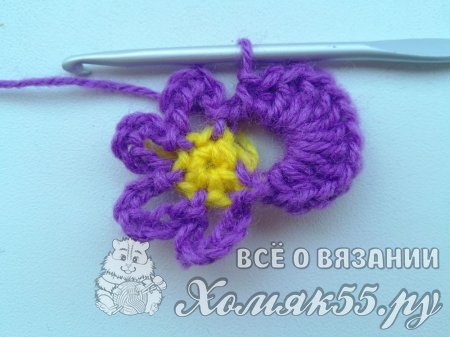 Теперь мы присоединим к серединке цветочка другую нитку. Ее цвет сиреневый. Мы выполняем шесть ВП. А в следующую петельку в основании будем провязывать один СС. Дальше снова будем делать шесть ВП и в следующую петельку основания цветка будем вязать СС. И дальше повторяем до конца. У нас должно в итоге получиться пять арок.