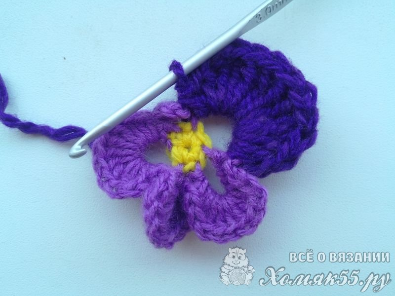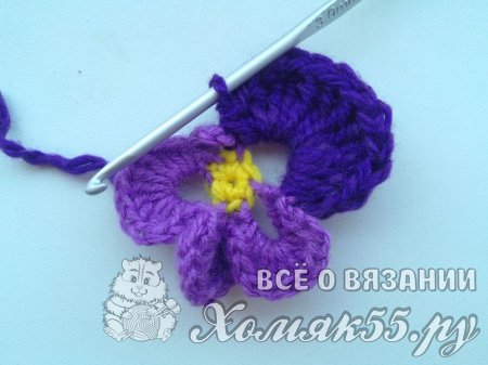 Меняем нитку дальше на фиолетовую, чтобы связать два больших лепестка. Вяжем в новую арку СБН, ПСН, ССН. И дальше будем выполнять восемь С2Н. После того как мы выполним эти восемь С2Н закончим вязание, провязав ССН, ПСН и СБН.