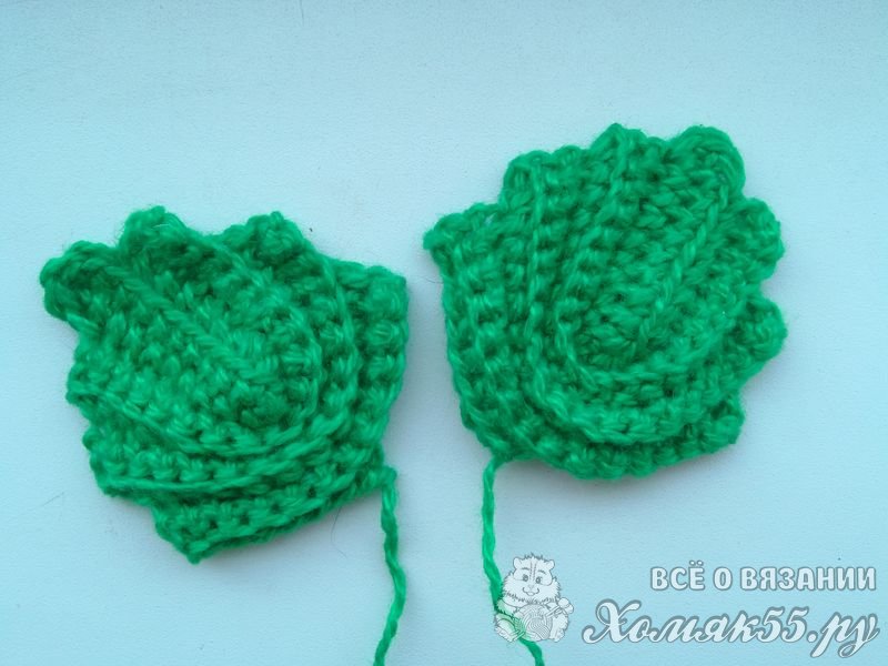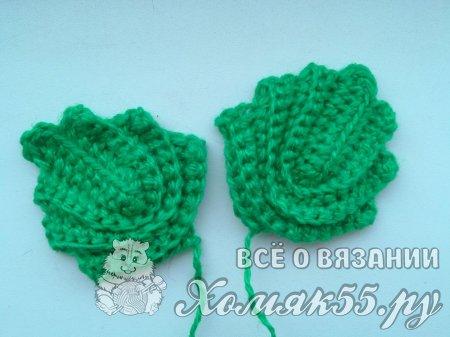 И так вяжем еще несколько рядов, не довязывая по две-три петли относительно предыдущего ряда. У нас получаются листья.