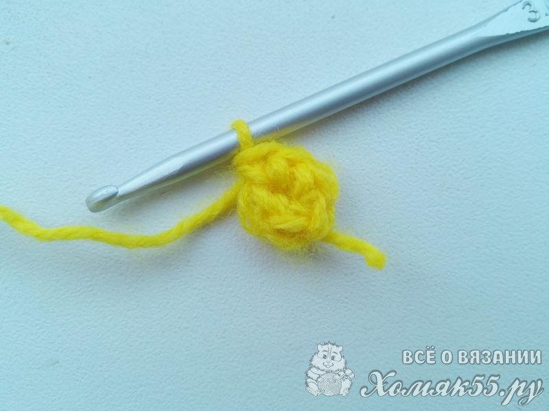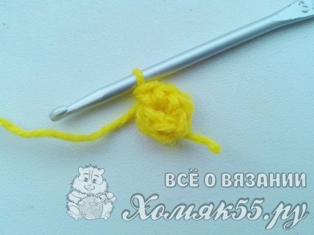 Начнем мы вязать цветок Анютины глазки с серединки. Она будет у него желтой. Свяжем две ВП. А дальше во вторую мы начинаем вязание шести СБН. У нас серединка уже готова.