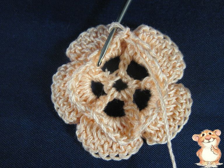 Теперь в каждую из арочек из 3 ВП провязываем последовательность – 1 столбик без накида (СБН), 2 ВП, 8 столбиков с 2 накидами (С2Н), 2 ВП, 1 СБН, 1 СС в соседнюю арку и повторяем последовательность.