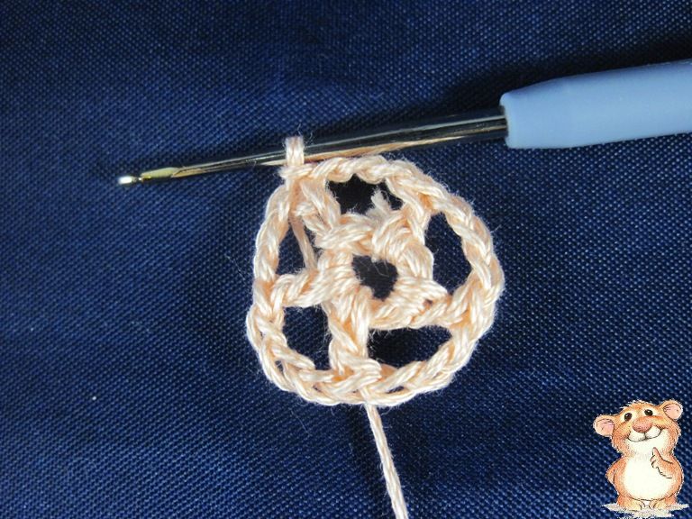 Через этот кружок провязываем следующую последовательность – 3 подъемные ВП, еще 3 ВП, 1 ССН через середину кружка, снова 3 ВП, 1 ССН через середину кружка и т.д. Всего должно получиться 5 ССН (с учетом 3 ВП).