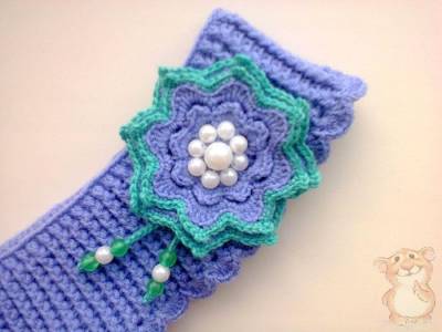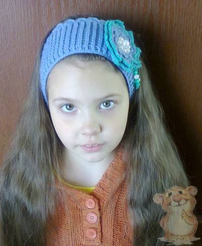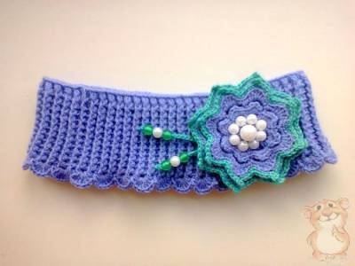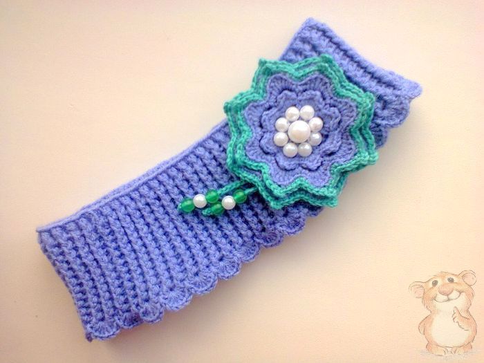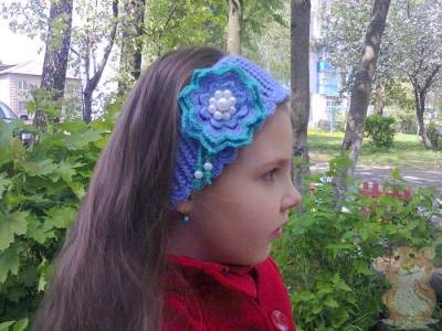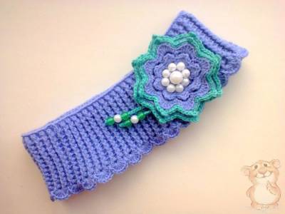 Я вязала цветок в качестве украшения теплой повязки на голову для девочки. Использовала нитки Ланаголд Файн, крючок подходящего размера, бусины, иголку с ниткой.