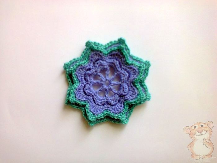 Я обвязала края столбиками без накида нитью другого цвета, делая пико на центральной петле каждого лепестка.