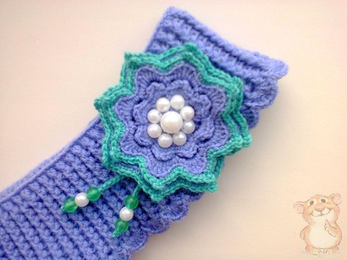 Потом берем изделие, которое собираемся украшать, иголку с ниткой и бусины. Украшаем бусинами центр цветка. Еще я сделала цепочку из 40 воздушных петель, зафиксировала ее центр под одним из лепестков, нанизала на каждый из концов бусины, и завязала узелки. Цветок стал еще краше. Если вы хотите получить более объемный цветок, то можете по своему усмотрению заменить столбики с одним накидом на столбики с двумя накидами, и увеличить количество рядов лепестков.
